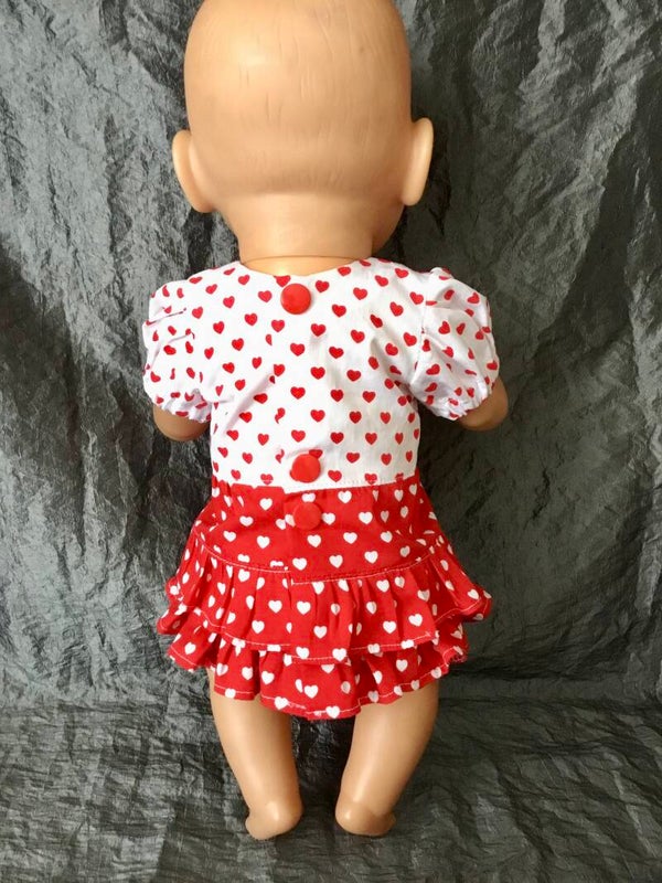 Jurkje met korte pofmouwtjes, heeft een strik middenvoor en de rok is in laagjes. De jurk sluit op de rug met drukknopen. Materiaal: katoen