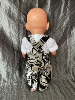 De schouderbanden zijn kruislings op de rug, blijven goed op de plaats zitten en sluiten aan de voorkant met drukkers. Achter in de taille is elastiek, waardoor het mooi aansluit op het lijfje van de pop.