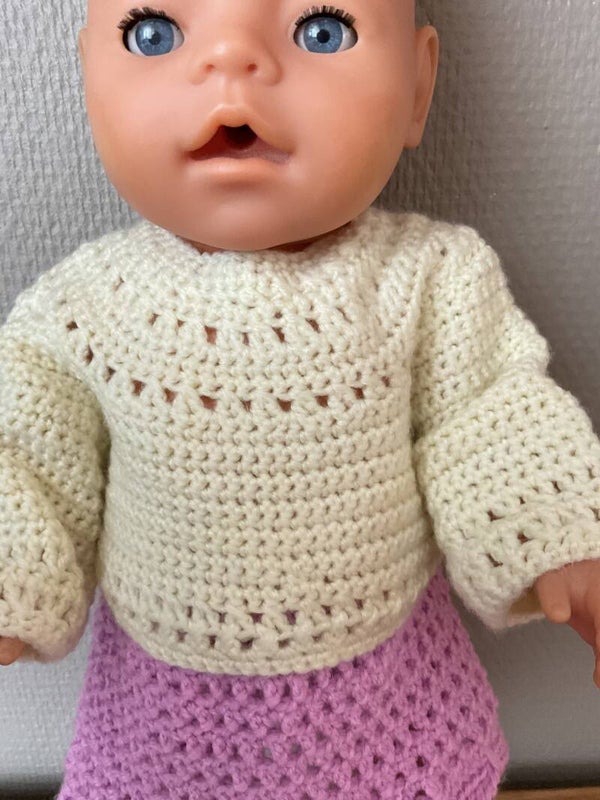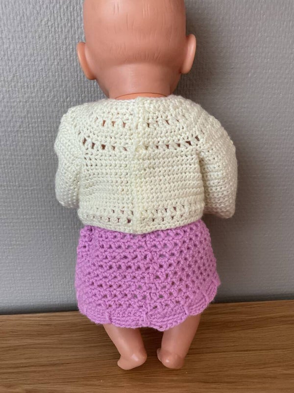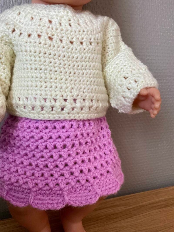 Dit lila rokje met truitje (off-white) is gemaakt van acryl garen. Het rokje heeft een schulprandje. De trui kan ook als vest worden gedragen. Dan is de sluiting aan de voorkant.