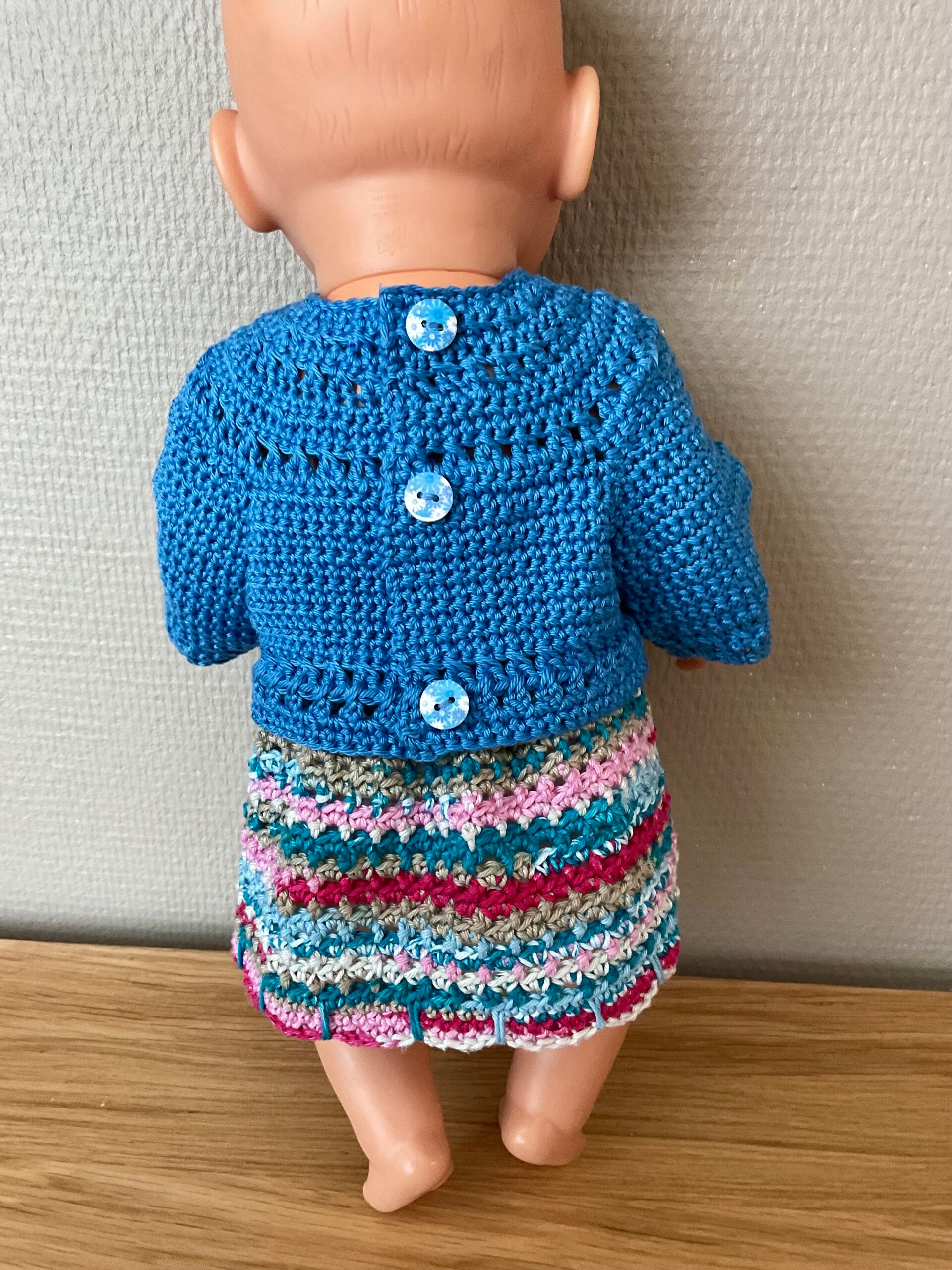 Dit veelkleurig rokje met blauwe truitje is gemaakt van katoenen garen. Het rokje heeft een schulprandje. De trui kan ook als vest worden gedragen. Dan is de sluiting aan de voorkant. Het is dus een keuzemogelijkheid