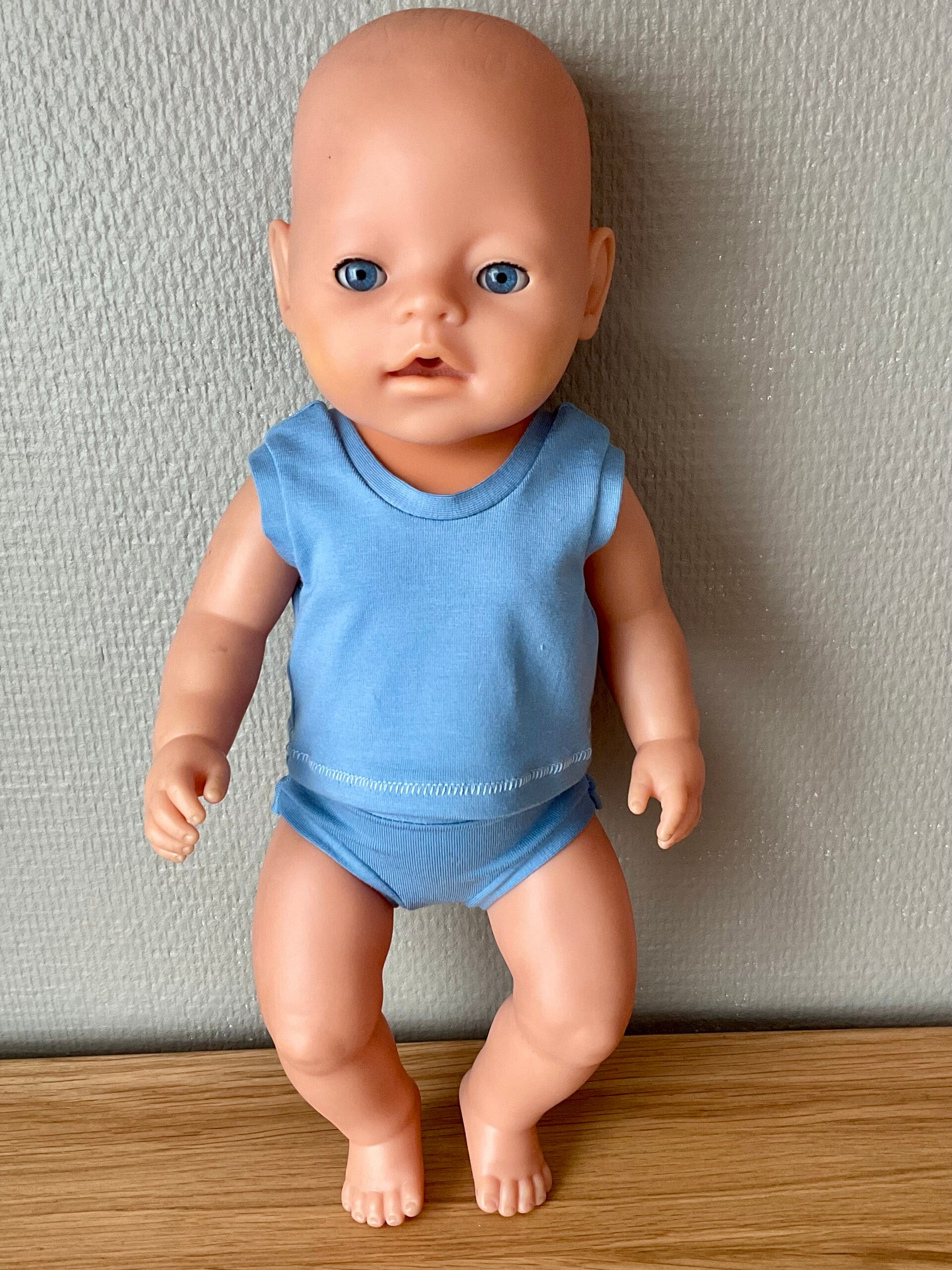 Overslag-hemdje in blauw tricot. Het hemdje sluit op de rug met klittenband.