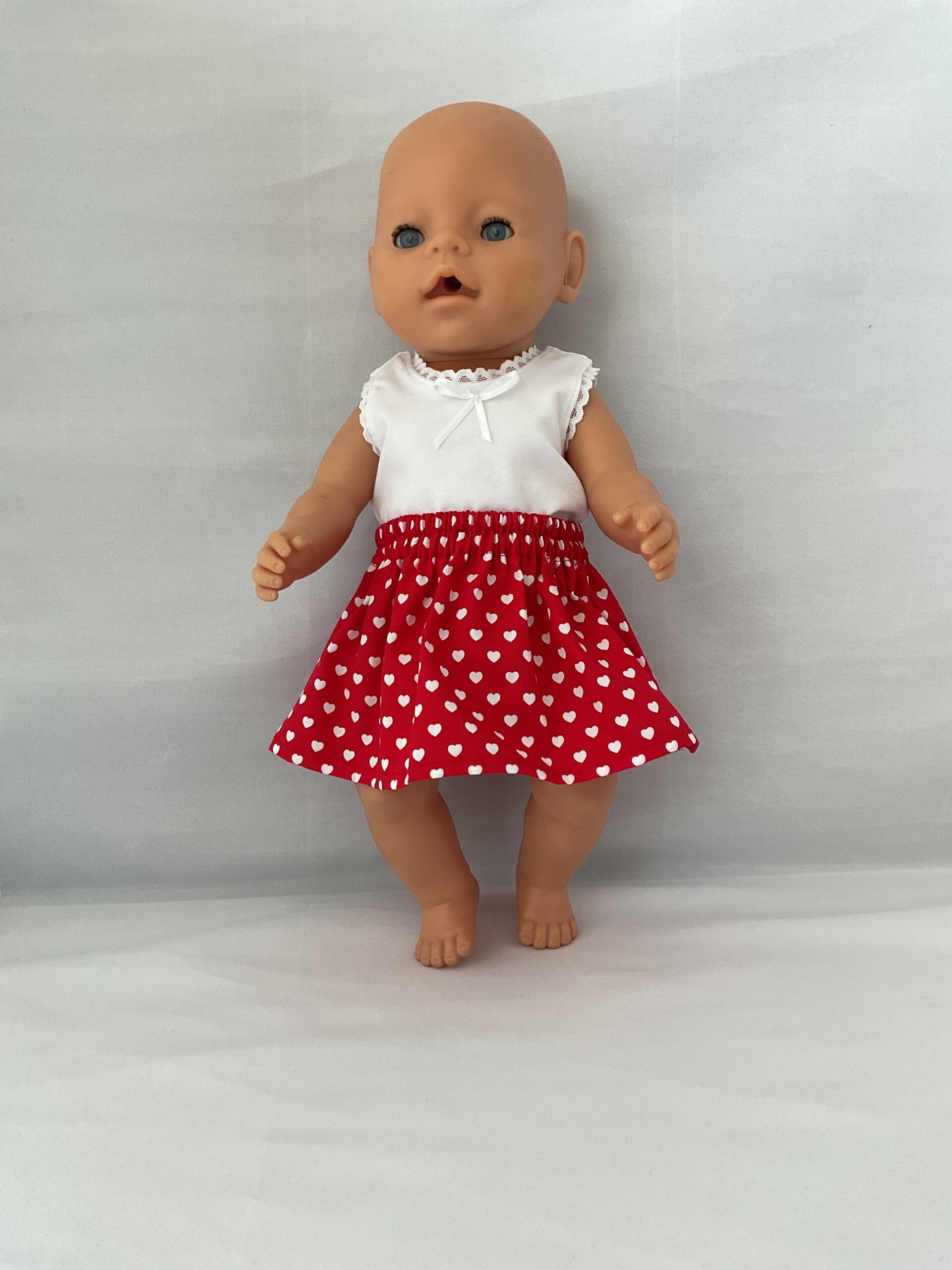 Een rode rok met witte hartjes. Een wijde rok met elastiek in de taille.