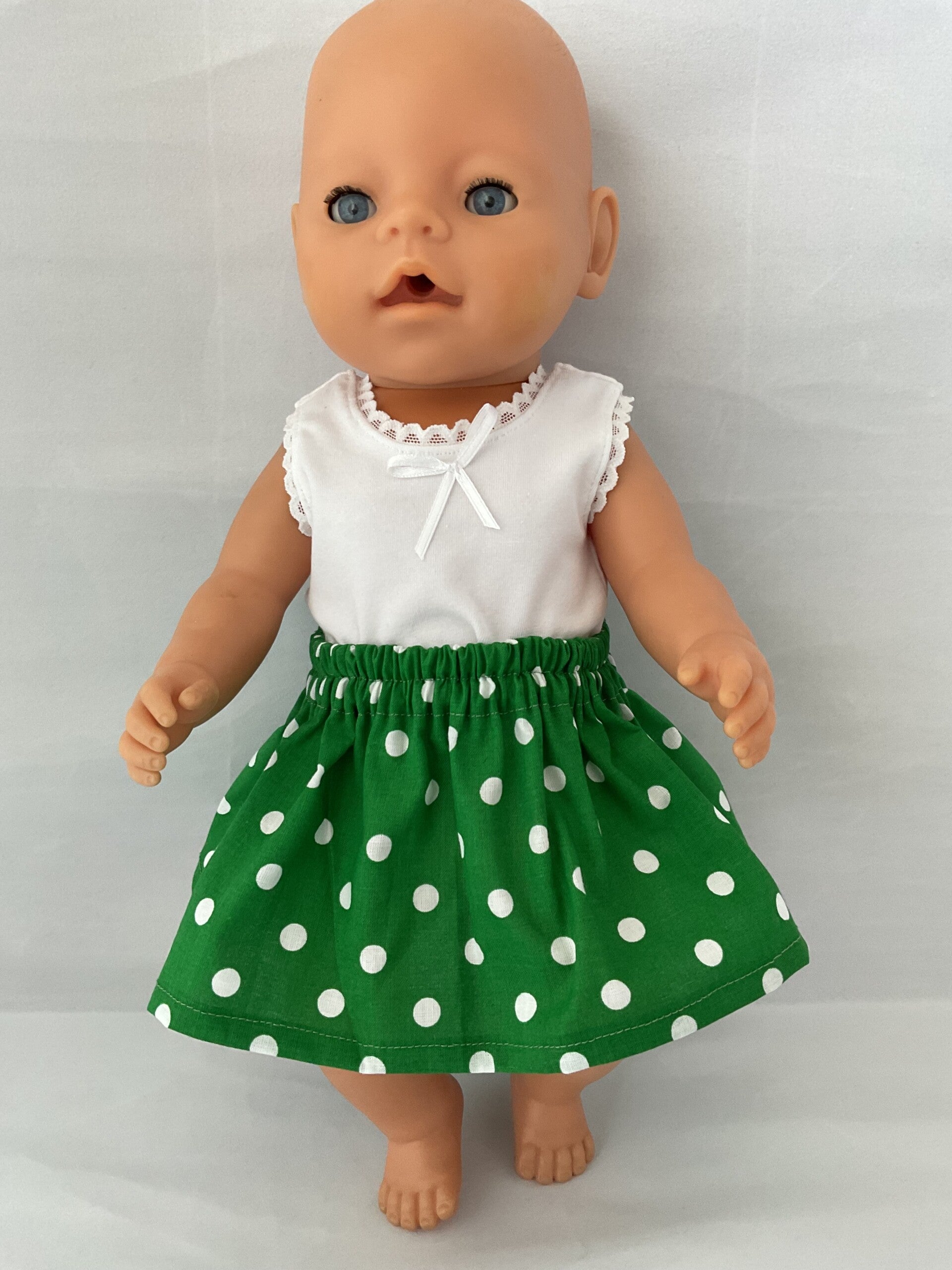 Een groene rok met stippen. De rok is wijd en heeft elastiek in de taille.