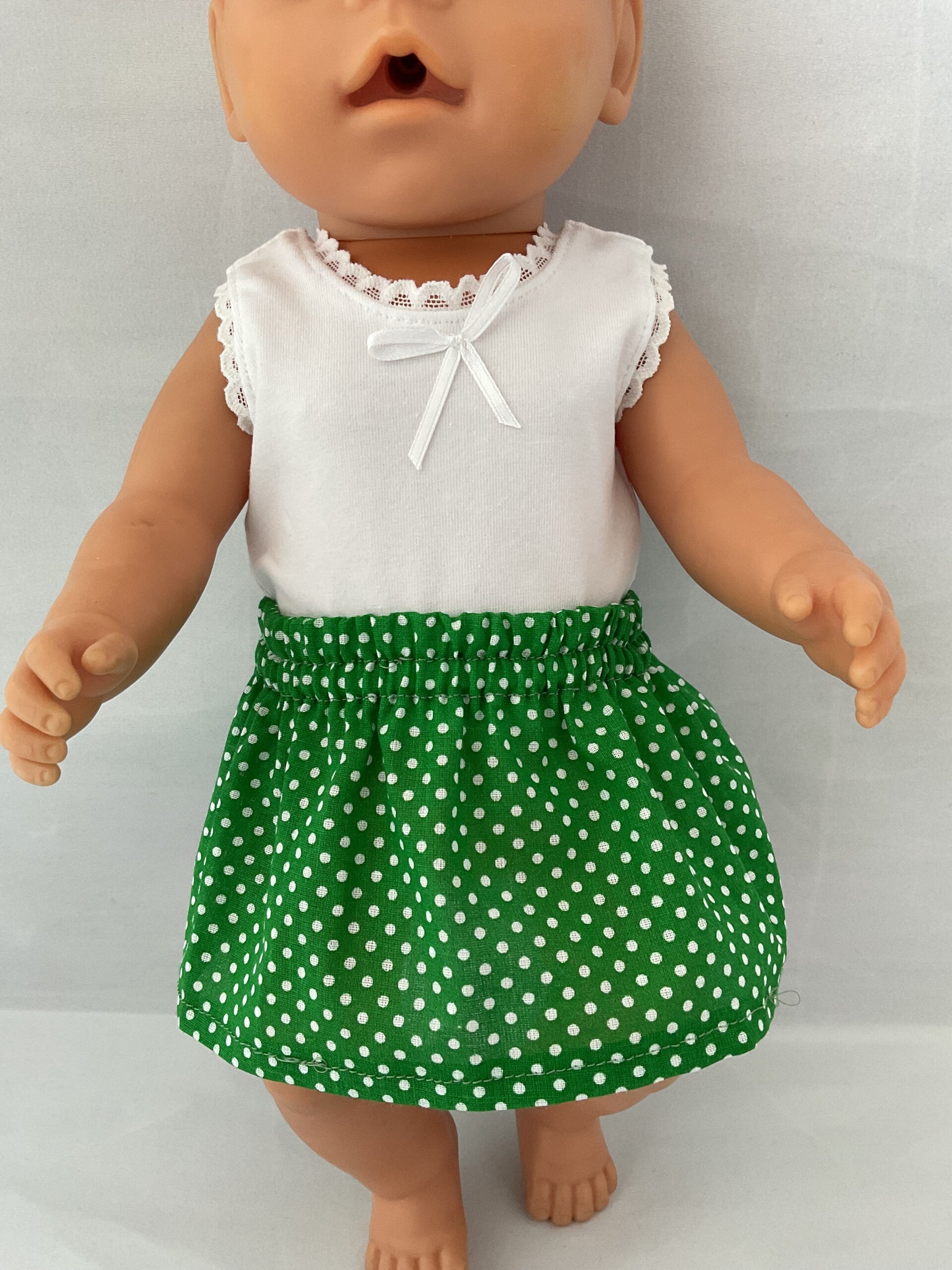 Een groene rok met kleine stippen. Een wijde rok met elastiek in de taille.