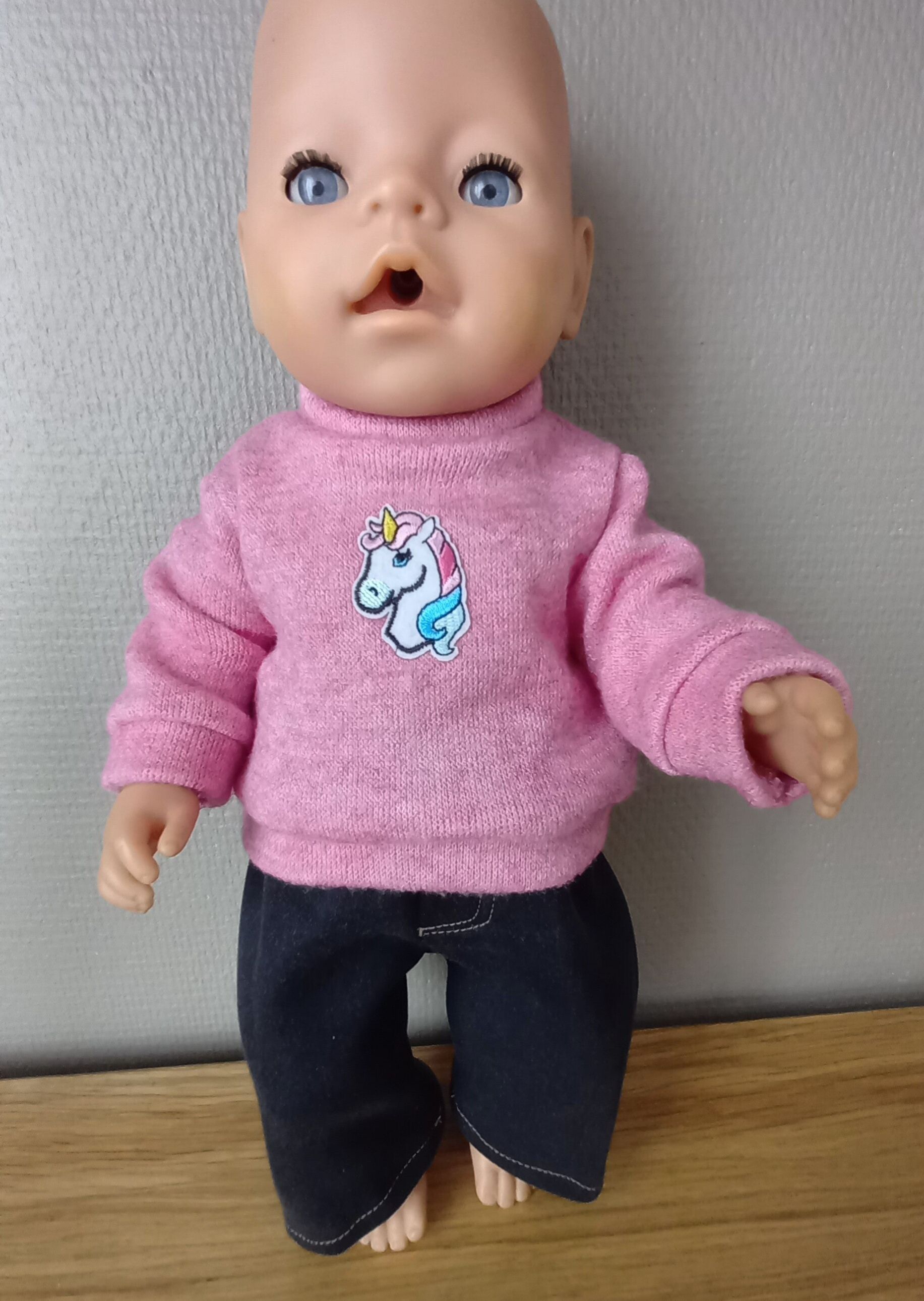 De trui is gemaakt van een zachte gebreide stof. Het heeft een leuke applicatie met een unicorn aan de voorkant. De trui sluit met drukknopen op de rug.