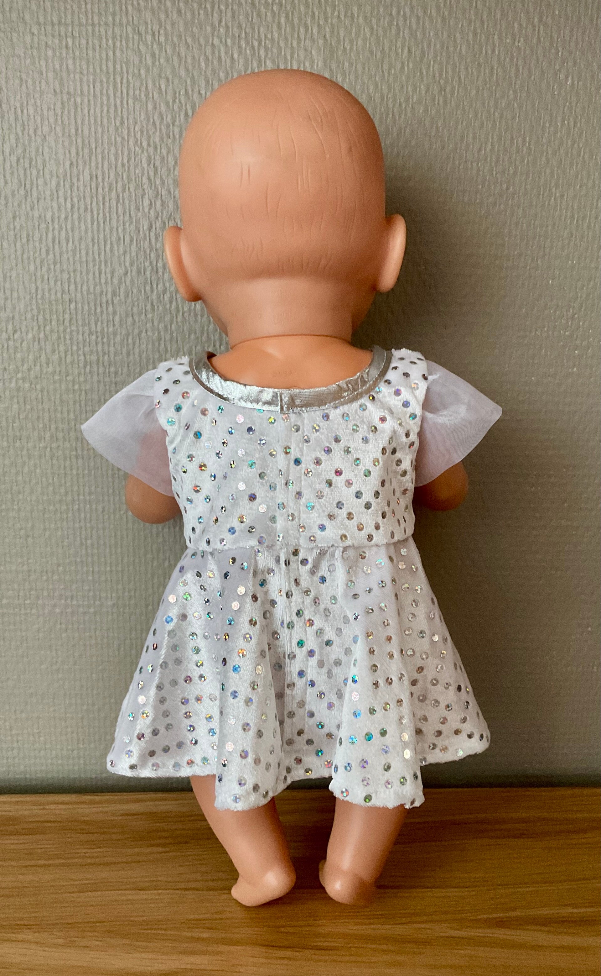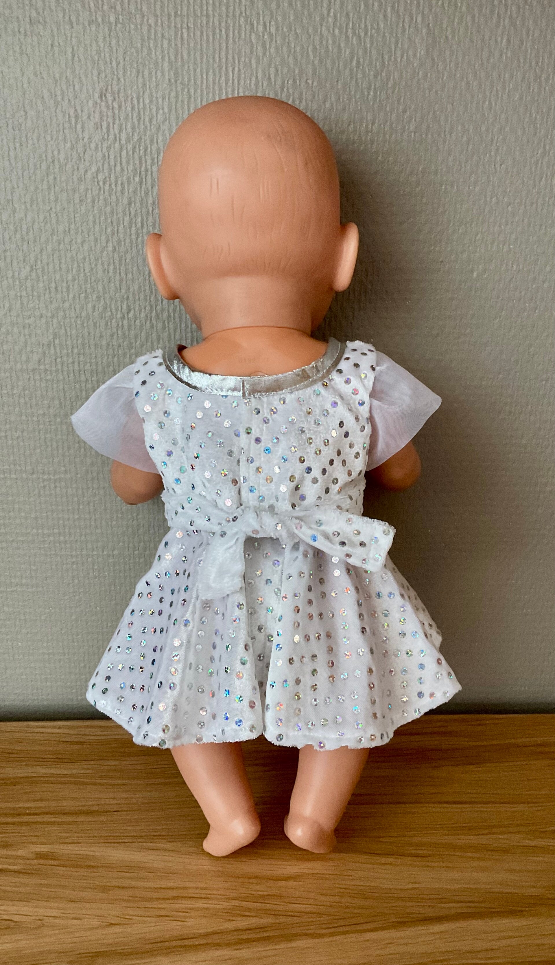 Een leuke jurk van glitterstof met een bijbehorend lint, welke gebruikt kan worden als haarlint of als ceintuur. De jurk heeft een cirkelrok en sluit op de rug met klittenband. Het lijfje is aan de hals afgezet met zilverkleurig biaisband en is aan de binnenkant gevoerd. De mouwtjes zijn gemaakt van organza.