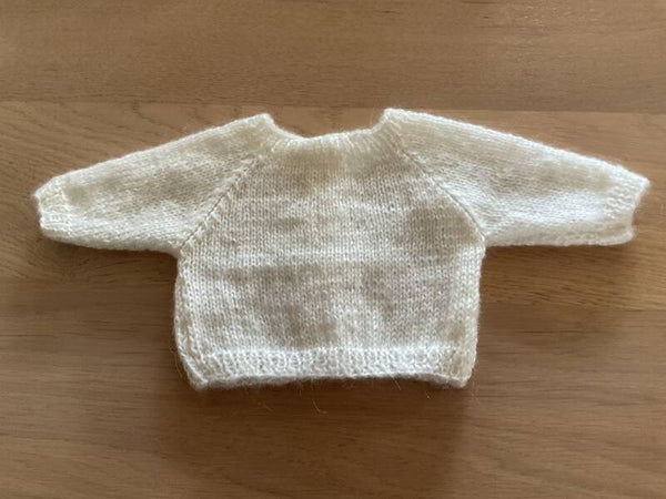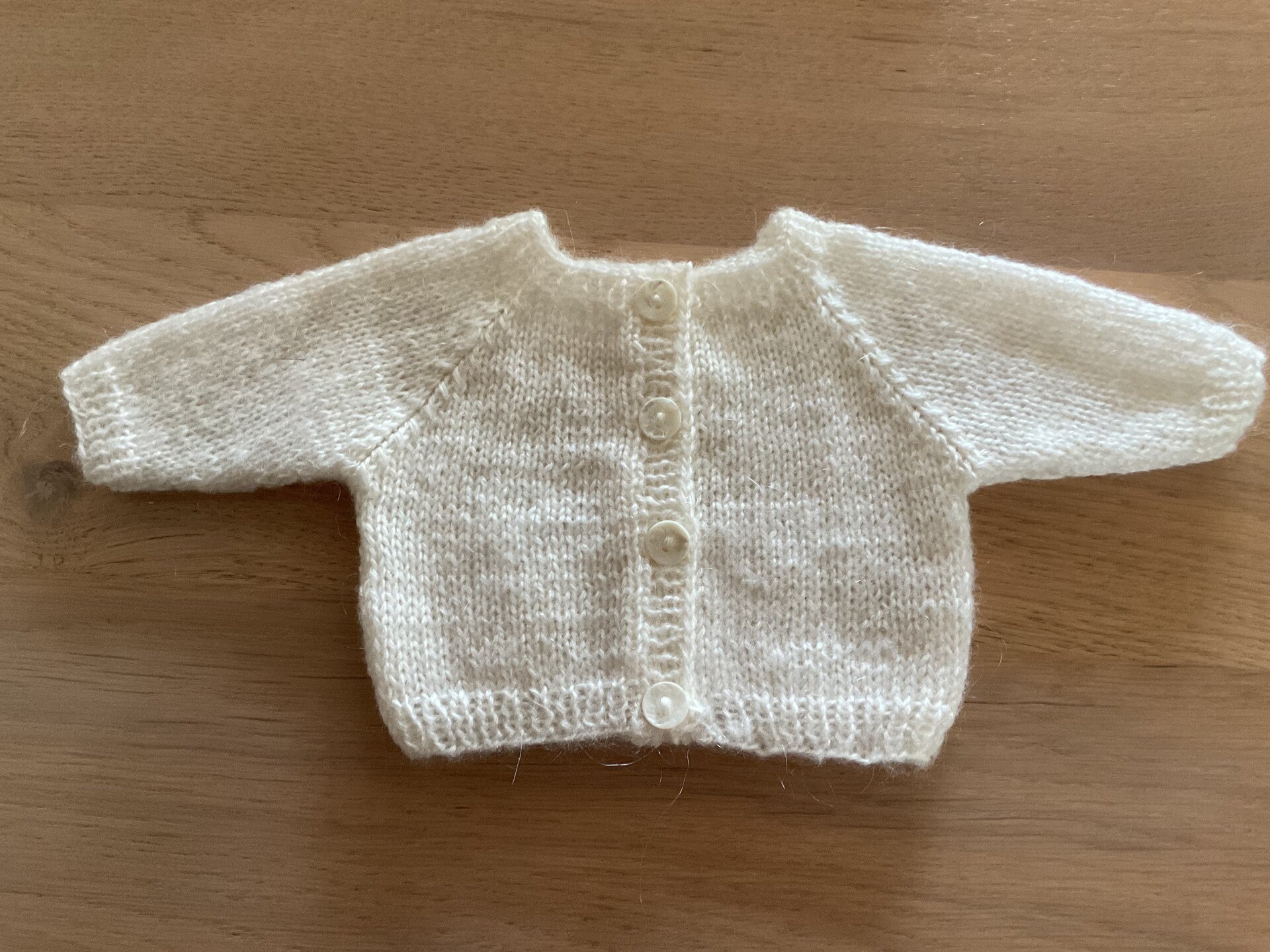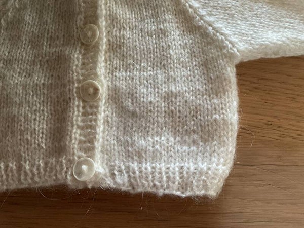 Vest in of-white. Het garen is ietwat pluizig (zie foto). Het krijgt hierdoor een luxe uitstraling. Het vest heeft raglan mouwen en sluit door middel van knoopjes.
