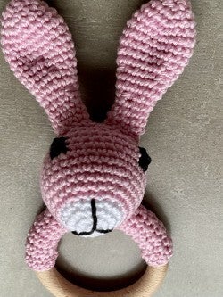 Bijtring Konijn: in de kleur roze. De maat = ca. 16 cm totale lengte. Er zit een rammelkraal in het knuffeltje.