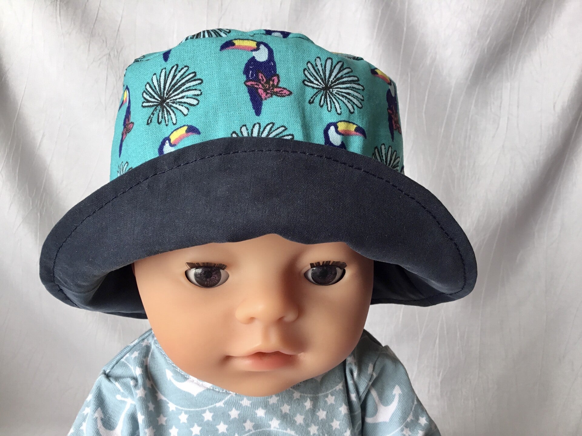 Leuk zonnehoedje voor de pop. Het hoedje heeft 2 draagbare kanten. Kleuren zoals op bijgaande foto. Materiaal = katoen